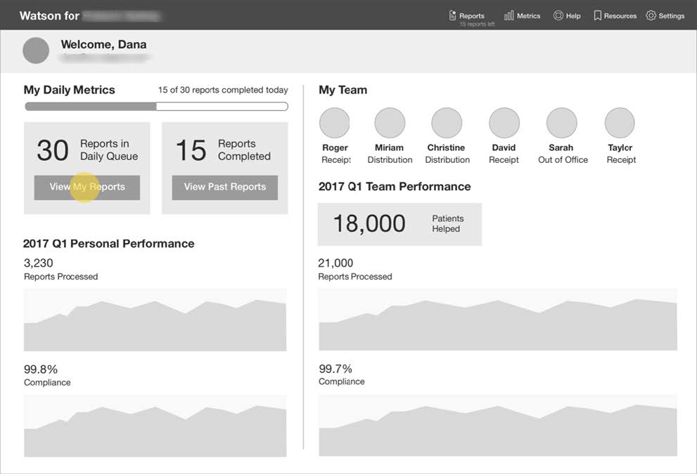 Low-fidelity wireframe: During our contextual inquiry we identified that users wanted to act more like a team. The Daily Metric page concept was born.