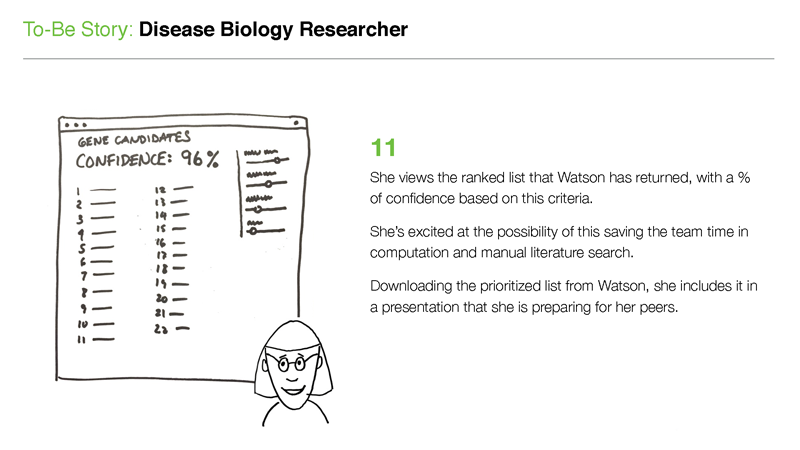 To-Be Storyboard: By surfacing prioritized candidates instantly, the new workflow dramatically reduces research time and accelerates the path from evidence to experiment.